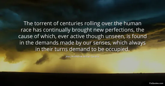 Brillat-Savarin, Jean Anthelme. (2026, February 17). The torrent of centuries rolling over the human race has continually brought new perfections, the cause of which, ever active though unseen, is found in the demands made by our senses, which always in their turns demand to be occupied. FixQuotes. https://fixquotes.com/quotes/the-torrent-of-centuries-rolling-over-the-human-106508/