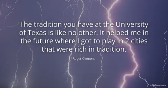 Clemens, Roger. (2026, January 15). The tradition you have at the University of Texas is like no other. It helped me in the future where I got to play in 2 cities that were rich in tradition. FixQuotes. https://fixquotes.com/quotes/the-tradition-you-have-at-the-university-of-texas-159610/
