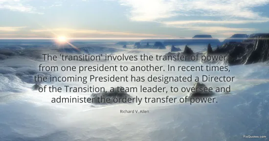 Allen, Richard V. (2026, January 15). The 'transition' involves the transfer of power from one president to another. In recent times, the incoming President has designated a Director of the Transition, a team leader, to oversee and administer the orderly transfer of power. FixQuotes. https://fixquotes.com/quotes/the-transition-involves-the-transfer-of-power-161354/