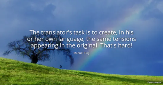 The blunt coda, "That's hard!", is doing more than sympathizing. It's an insistence that difficulty is the point. Translation becomes an act of authorship with moral stakes: you must recreate the pressure without imitating the surface. Puig implies a kind of fidelity that sounds paradoxical - less about equivalence, more about risk. If the original makes you uneasy, the translation should, too.