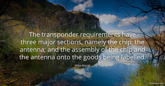 Marsh, Mike. "The transponder requirements have three major sections, namely the chip; the antenna; and the assembly of the chip and the antenna onto the goods being labelled." FixQuotes. January 16, 2026. https://fixquotes.com/quotes/the-transponder-requirements-have-three-major-93760/.
