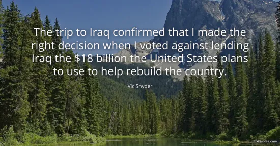 Snyder, Vic. (2026, January 16). The trip to Iraq confirmed that I made the right decision when I voted against lending Iraq the $18 billion the United States plans to use to help rebuild the country. FixQuotes. https://fixquotes.com/quotes/the-trip-to-iraq-confirmed-that-i-made-the-right-123839/