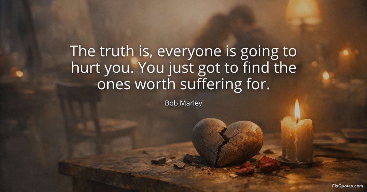 Marley, Bob. (2026, February 9). The truth is, everyone is going to hurt you. You just got to find the ones worth suffering for. FixQuotes. https://fixquotes.com/quotes/the-truth-is-everyone-is-going-to-hurt-you-you-172001/
