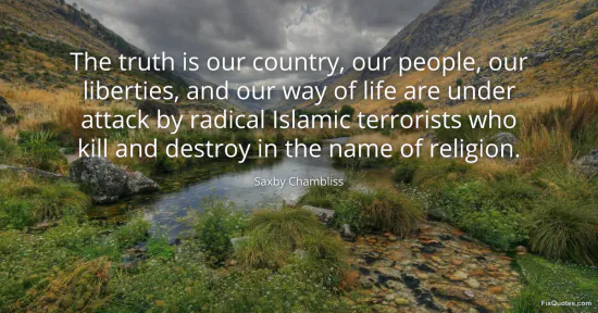 Chambliss, Saxby. (2026, January 15). The truth is our country, our people, our liberties, and our way of life are under attack by radical Islamic terrorists who kill and destroy in the name of religion. FixQuotes. https://fixquotes.com/quotes/the-truth-is-our-country-our-people-our-liberties-154118/