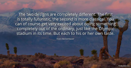 Beckenbauer, Franz. "The two designs are completely different. The first is totally futuristic, the second is more classical. You can of course get very excited about doing something completely out of the ordinary, just like the Olympic stadium in its time. But each to his or her own taste." FixQuotes. January 17, 2026. https://fixquotes.com/quotes/the-two-designs-are-completely-different-the-51682/.