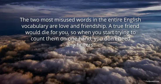 Flynt, Larry. (2026, January 18). The two most misused words in the entire English vocabulary are love and friendship. A true friend would die for you, so when you start trying to count them on one hand, you don't need any fingers. FixQuotes. https://fixquotes.com/quotes/the-two-most-misused-words-in-the-entire-english-8980/
