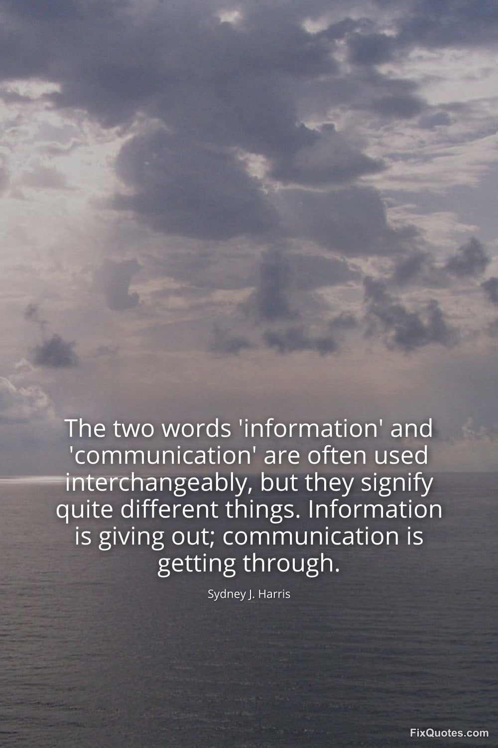 Harris, Sydney J. (2026, February 12). The two words 'information' and 'communication' are often used interchangeably, but they signify quite different things. Information is giving out; communication is getting through. FixQuotes. https://fixquotes.com/quotes/the-two-words-information-and-communication-are-173052/
