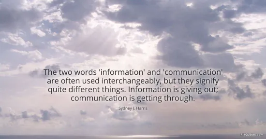 Harris, Sydney J. "The two words 'information' and 'communication' are often used interchangeably, but they signify quite different things. Information is giving out; communication is getting through." FixQuotes. February 12, 2026. https://fixquotes.com/quotes/the-two-words-information-and-communication-are-173052/.