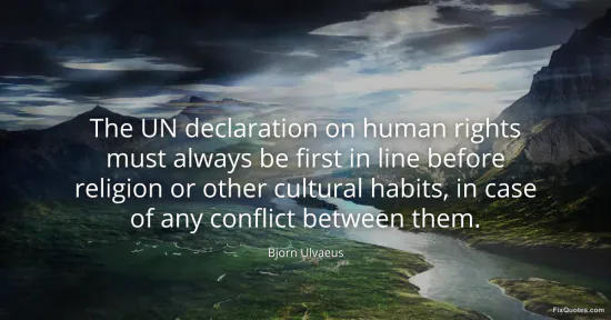 Ulvaeus, Bjorn. (2026, January 15). The UN declaration on human rights must always be first in line before religion or other cultural habits, in case of any conflict between them. FixQuotes. https://fixquotes.com/quotes/the-un-declaration-on-human-rights-must-always-be-139652/
