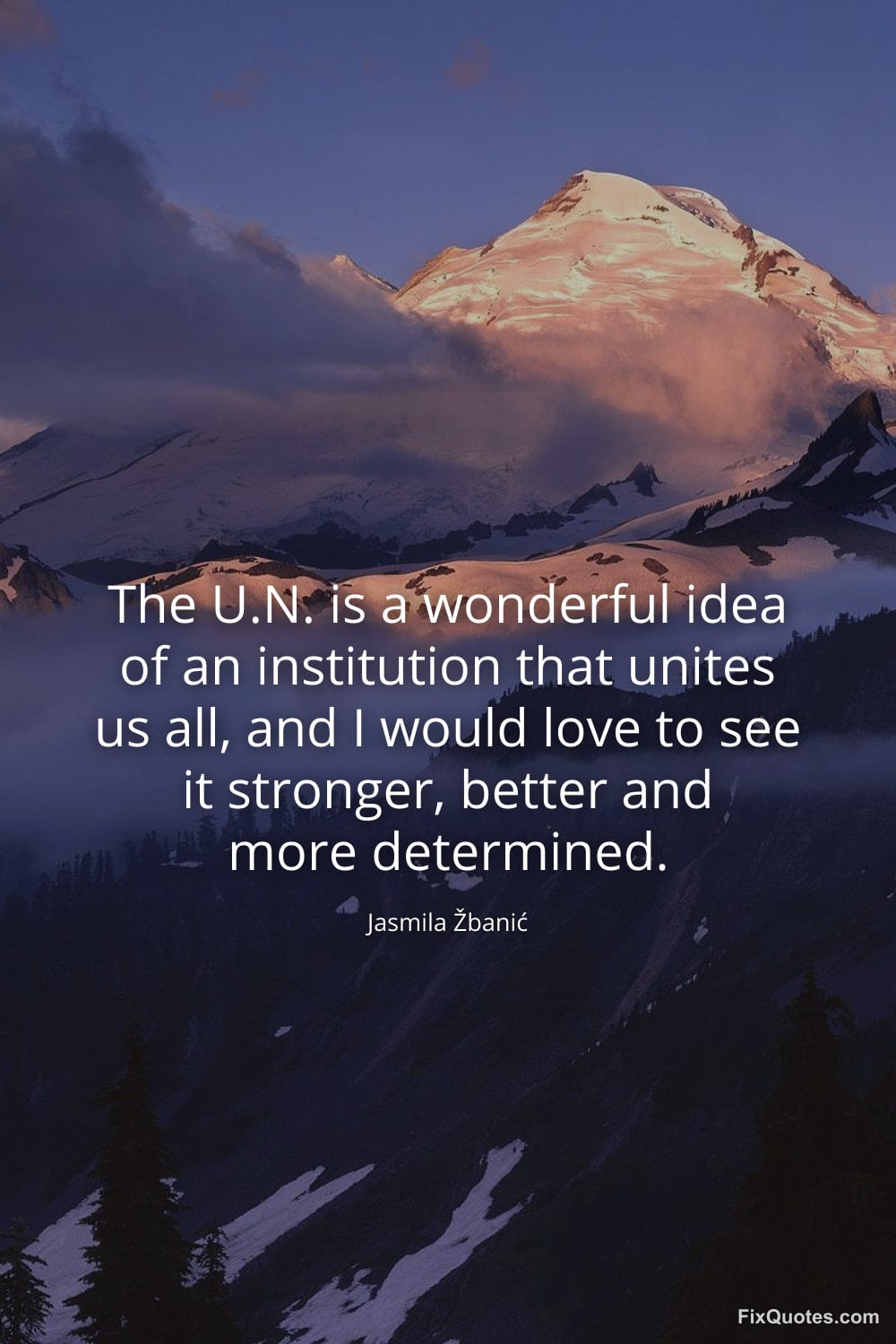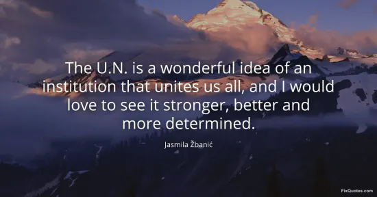 Žbanić, Jasmila. (2026, February 15). The U.N. is a wonderful idea of an institution that unites us all, and I would love to see it stronger, better and more determined. FixQuotes. https://fixquotes.com/quotes/the-un-is-a-wonderful-idea-of-an-institution-that-185388/