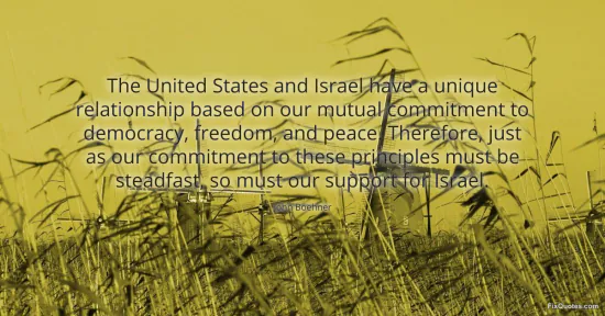 Boehner, John. "The United States and Israel have a unique relationship based on our mutual commitment to democracy, freedom, and peace. Therefore, just as our commitment to these principles must be steadfast, so must our support for Israel." FixQuotes. January 17, 2026. https://fixquotes.com/quotes/the-united-states-and-israel-have-a-unique-51860/.