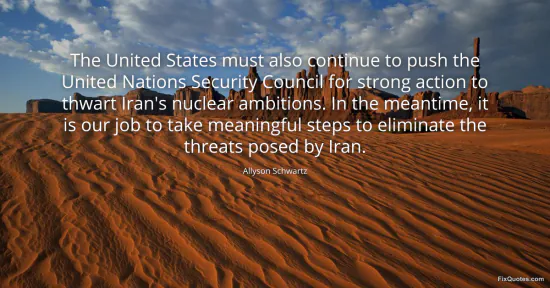 Schwartz, Allyson. "The United States must also continue to push the United Nations Security Council for strong action to thwart Iran's nuclear ambitions. In the meantime, it is our job to take meaningful steps to eliminate the threats posed by Iran." FixQuotes. January 15, 2026. https://fixquotes.com/quotes/the-united-states-must-also-continue-to-push-the-149441/.