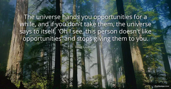 Coupland, Doug. (2026, January 17). The universe hands you opportunities for a while, and if you don't take them, the universe says to itself, 'Oh I see, this person doesn't like opportunities' and stops giving them to you. FixQuotes. https://fixquotes.com/quotes/the-universe-hands-you-opportunities-for-a-while-44728/