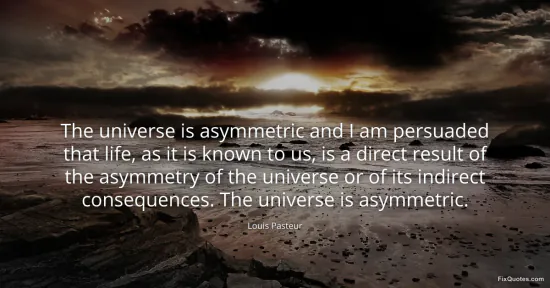 Pasteur, Louis. "The universe is asymmetric and I am persuaded that life, as it is known to us, is a direct result of the asymmetry of the universe or of its indirect consequences. The universe is asymmetric." FixQuotes. February 28, 2026. https://fixquotes.com/quotes/the-universe-is-asymmetric-and-i-am-persuaded-17827/.
