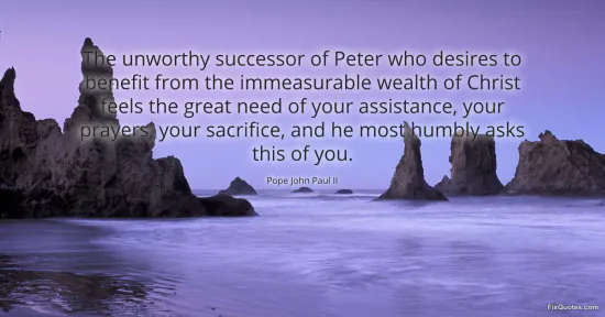 II, Pope John Paul. "The unworthy successor of Peter who desires to benefit from the immeasurable wealth of Christ feels the great need of your assistance, your prayers, your sacrifice, and he most humbly asks this of you." FixQuotes. January 18, 2026. https://fixquotes.com/quotes/the-unworthy-successor-of-peter-who-desires-to-9506/.