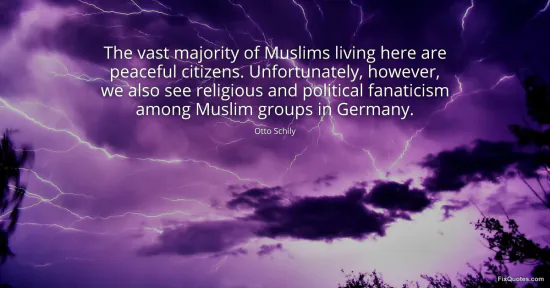 Schily, Otto. (2026, January 15). The vast majority of Muslims living here are peaceful citizens. Unfortunately, however, we also see religious and political fanaticism among Muslim groups in Germany. FixQuotes. https://fixquotes.com/quotes/the-vast-majority-of-muslims-living-here-are-78637/
