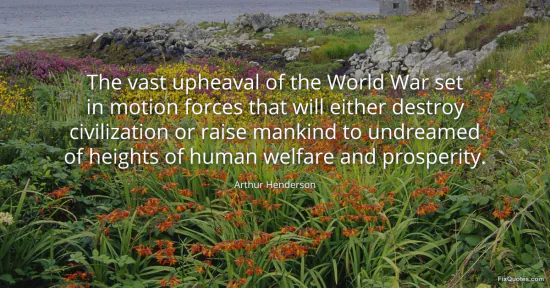 Henderson, Arthur. (2026, January 17). The vast upheaval of the World War set in motion forces that will either destroy civilization or raise mankind to undreamed of heights of human welfare and prosperity. FixQuotes. https://fixquotes.com/quotes/the-vast-upheaval-of-the-world-war-set-in-motion-46415/