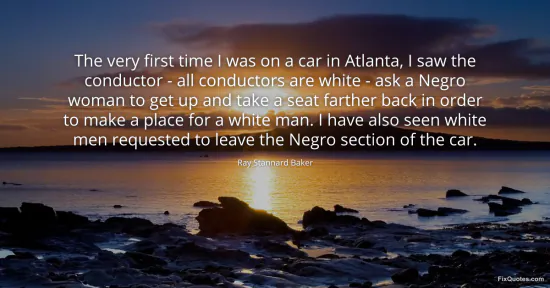 Baker, Ray Stannard. "The very first time I was on a car in Atlanta, I saw the conductor - all conductors are white - ask a Negro woman to get up and take a seat farther back in order to make a place for a white man. I have also seen white men requested to leave the Negro section of the car." FixQuotes. January 15, 2026. https://fixquotes.com/quotes/the-very-first-time-i-was-on-a-car-in-atlanta-i-157067/.