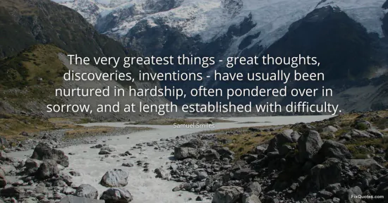 Smiles, Samuel. "The very greatest things - great thoughts, discoveries, inventions - have usually been nurtured in hardship, often pondered over in sorrow, and at length established with difficulty." FixQuotes. January 15, 2026. https://fixquotes.com/quotes/the-very-greatest-things-great-thoughts-38059/.