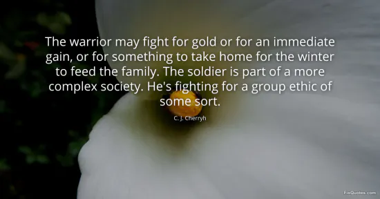 Cherryh, C. J. "The warrior may fight for gold or for an immediate gain, or for something to take home for the winter to feed the family. The soldier is part of a more complex society. He's fighting for a group ethic of some sort." FixQuotes. January 17, 2026. https://fixquotes.com/quotes/the-warrior-may-fight-for-gold-or-for-an-79041/.