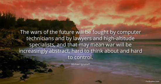 Ignatieff, Michael. (2026, January 15). The wars of the future will be fought by computer technicians and by lawyers and high-altitude specialists, and that may mean war will be increasingly abstract, hard to think about and hard to control. FixQuotes. https://fixquotes.com/quotes/the-wars-of-the-future-will-be-fought-by-computer-150986/