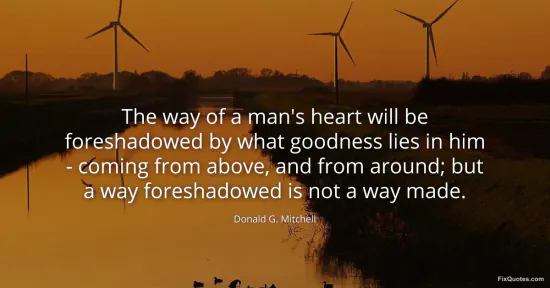 Mitchell, Donald G. (2026, January 15). The way of a man's heart will be foreshadowed by what goodness lies in him - coming from above, and from around; but a way foreshadowed is not a way made. FixQuotes. https://fixquotes.com/quotes/the-way-of-a-mans-heart-will-be-foreshadowed-by-104222/
