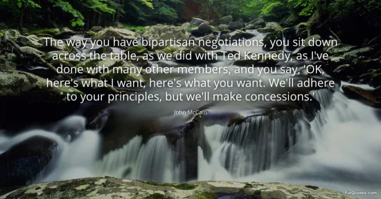 McCain, John. "The way you have bipartisan negotiations, you sit down across the table, as we did with Ted Kennedy, as I've done with many other members, and you say, 'OK, here's what I want, here's what you want. We'll adhere to your principles, but we'll make concessions.'." FixQuotes. January 17, 2026. https://fixquotes.com/quotes/the-way-you-have-bipartisan-negotiations-you-sit-60021/.