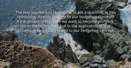 Collins, James. (2026, January 15). The way you want to respond is to ask a question: Is this technology directly relevant to our hedgehog concept? If the answer is YES, then we want to become pioneers, not in the technology, but in the application of that technology specifically linked to our hedgehog concept. FixQuotes. https://fixquotes.com/quotes/the-way-you-want-to-respond-is-to-ask-a-question-169462/