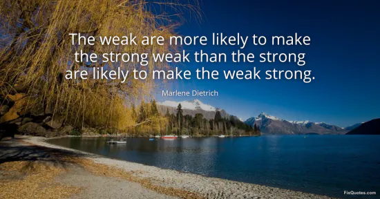 Dietrich, Marlene. (2026, January 16). The weak are more likely to make the strong weak than the strong are likely to make the weak strong. FixQuotes. https://fixquotes.com/quotes/the-weak-are-more-likely-to-make-the-strong-weak-93302/