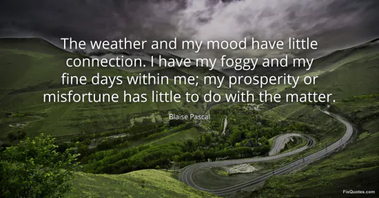 Pascal, Blaise. "The weather and my mood have little connection. I have my foggy and my fine days within me; my prosperity or misfortune has little to do with the matter." FixQuotes. January 18, 2026. https://fixquotes.com/quotes/the-weather-and-my-mood-have-little-connection-i-5086/.