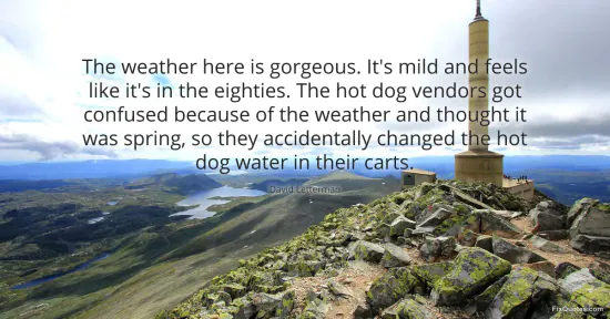 Letterman, David. (2026, January 17). The weather here is gorgeous. It's mild and feels like it's in the eighties. The hot dog vendors got confused because of the weather and thought it was spring, so they accidentally changed the hot dog water in their carts. FixQuotes. https://fixquotes.com/quotes/the-weather-here-is-gorgeous-its-mild-and-feels-69572/