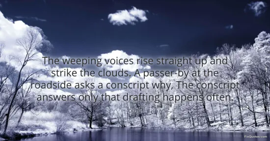 "The weeping voices rise straight up and strike the clouds. A passer-by at the roadside asks a conscript why, The conscript answers only that drafting happens often." FixQuotes, 15 Jan. 2026, https://fixquotes.com/quotes/the-weeping-voices-rise-straight-up-and-strike-53222/. Accessed 13 Feb. 2026.