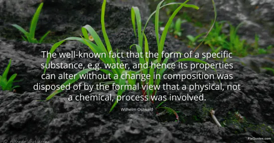 Ostwald, Wilhelm. "The well-known fact that the form of a specific substance, e.g. water, and hence its properties can alter without a change in composition was disposed of by the formal view that a physical, not a chemical, process was involved." FixQuotes. January 18, 2026. https://fixquotes.com/quotes/the-well-known-fact-that-the-form-of-a-specific-10938/.