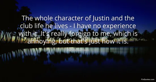Harrison, Randy. "The whole character of Justin and the club life he lives - I have no experience with it. It's really foreign to me, which is annoying, but that's just how it is." FixQuotes. January 16, 2026. https://fixquotes.com/quotes/the-whole-character-of-justin-and-the-club-life-94199/.