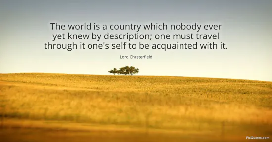 Chesterfield, Lord. (2026, January 18). The world is a country which nobody ever yet knew by description; one must travel through it one's self to be acquainted with it. FixQuotes. https://fixquotes.com/quotes/the-world-is-a-country-which-nobody-ever-yet-knew-12088/