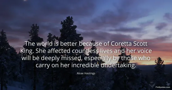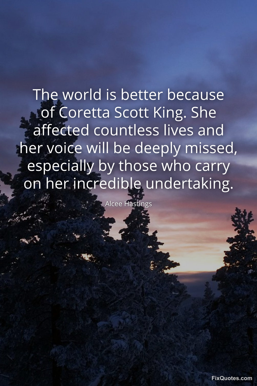 Hastings, Alcee. (2026, January 15). The world is better because of Coretta Scott King. She affected countless lives and her voice will be deeply missed, especially by those who carry on her incredible undertaking. FixQuotes. https://fixquotes.com/quotes/the-world-is-better-because-of-coretta-scott-king-166911/