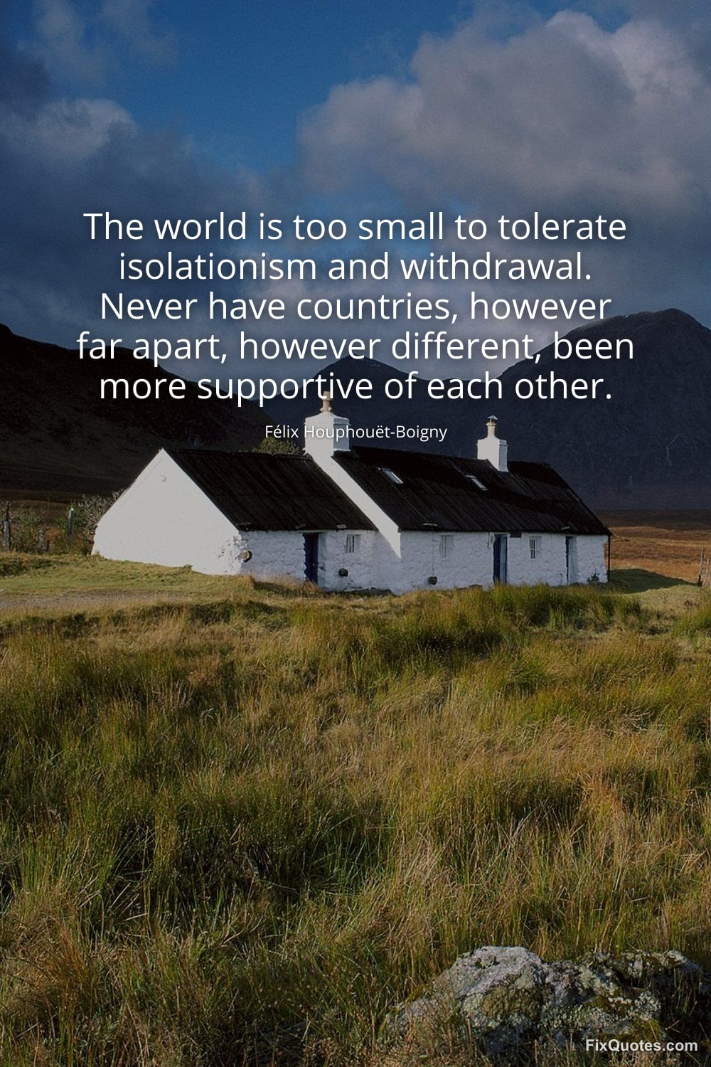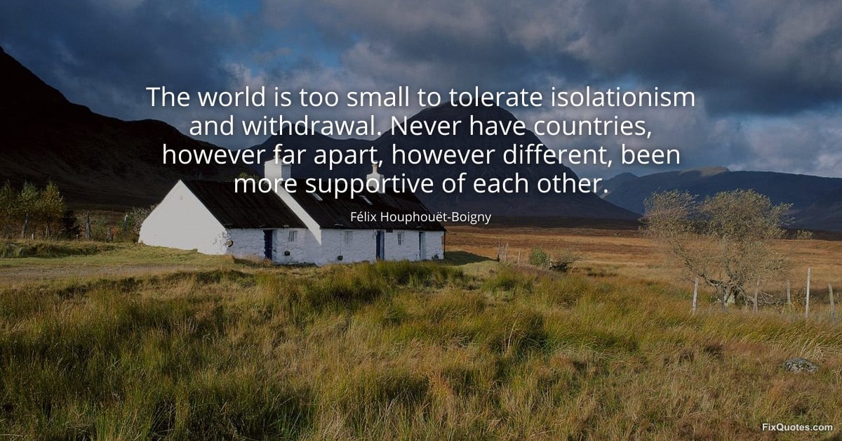 Houphouët-Boigny, Félix. "The world is too small to tolerate isolationism and withdrawal. Never have countries, however far apart, however different, been more supportive of each other." FixQuotes. February 17, 2026. https://fixquotes.com/quotes/the-world-is-too-small-to-tolerate-isolationism-185596/.