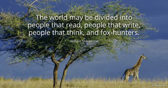 Shenstone, William. "The world may be divided into people that read, people that write, people that think, and fox-hunters." FixQuotes. January 15, 2026. https://fixquotes.com/quotes/the-world-may-be-divided-into-people-that-read-98038/.