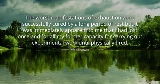 Ostwald, Wilhelm. "The worst manifestations of exhaustion were successfully cured by a long period of rest but it was immediately apparent to me that I had lost once and for all my former capacity for carrying out experimental work until physically tired." FixQuotes. January 18, 2026. https://fixquotes.com/quotes/the-worst-manifestations-of-exhaustion-were-10939/.