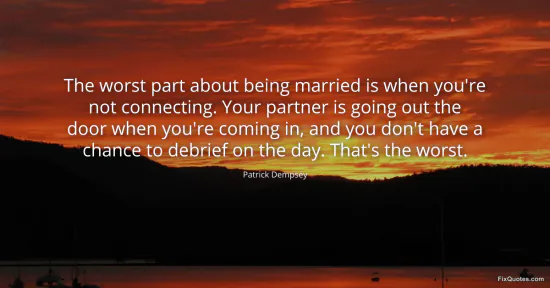 Dempsey, Patrick. "The worst part about being married is when you're not connecting. Your partner is going out the door when you're coming in, and you don't have a chance to debrief on the day. That's the worst." FixQuotes. January 16, 2026. https://fixquotes.com/quotes/the-worst-part-about-being-married-is-when-youre-90995/.
