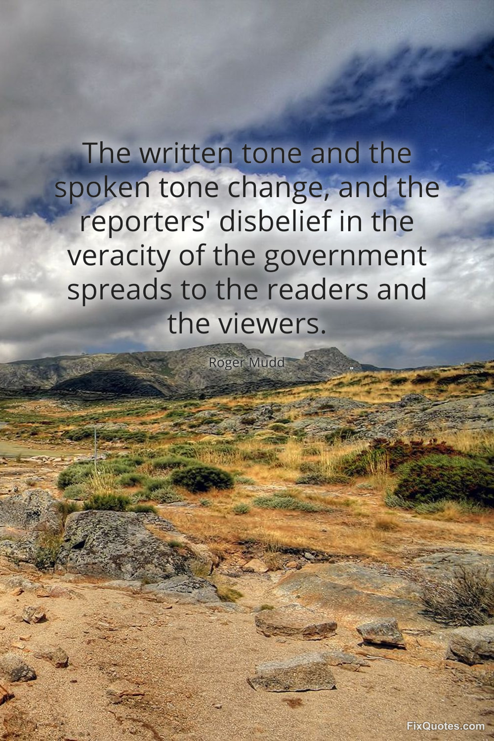 Mudd, Roger. (2026, February 16). The written tone and the spoken tone change, and the reporters' disbelief in the veracity of the government spreads to the readers and the viewers. FixQuotes. https://fixquotes.com/quotes/the-written-tone-and-the-spoken-tone-change-and-94983/