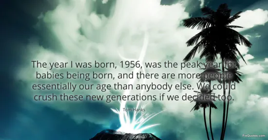 Hanks, Tom. "The year I was born, 1956, was the peak year for babies being born, and there are more people essentially our age than anybody else. We could crush these new generations if we decided too." FixQuotes. January 15, 2026. https://fixquotes.com/quotes/the-year-i-was-born-1956-was-the-peak-year-for-160083/.
