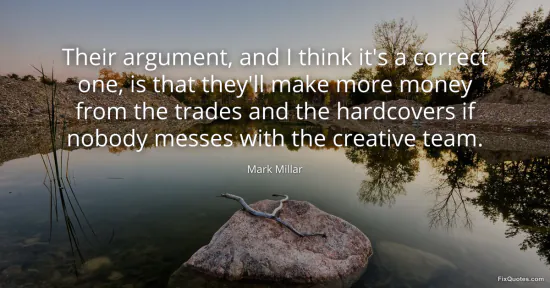 Millar, Mark. (2026, January 18). Their argument, and I think it's a correct one, is that they'll make more money from the trades and the hardcovers if nobody messes with the creative team. FixQuotes. https://fixquotes.com/quotes/their-argument-and-i-think-its-a-correct-one-is-20895/