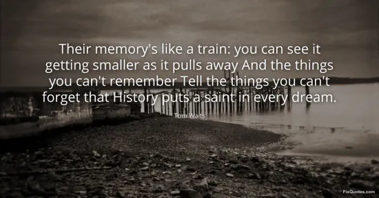 Waits, Tom. "Their memory's like a train: you can see it getting smaller as it pulls away And the things you can't remember Tell the things you can't forget that History puts a saint in every dream." FixQuotes. January 16, 2026. https://fixquotes.com/quotes/their-memorys-like-a-train-you-can-see-it-getting-126898/.