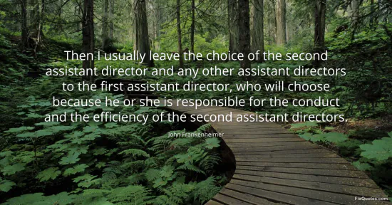 Frankenheimer, John. "Then I usually leave the choice of the second assistant director and any other assistant directors to the first assistant director, who will choose because he or she is responsible for the conduct and the efficiency of the second assistant directors." FixQuotes. January 16, 2026. https://fixquotes.com/quotes/then-i-usually-leave-the-choice-of-the-second-98284/.