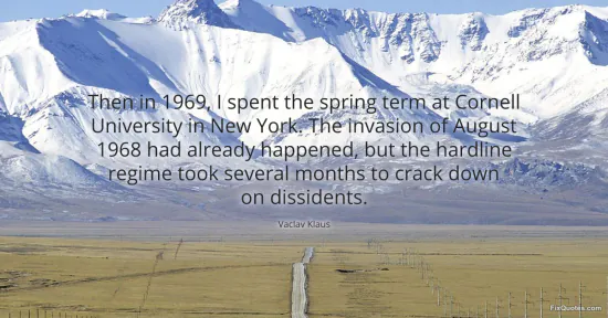 Klaus, Vaclav. (2026, January 16). Then in 1969, I spent the spring term at Cornell University in New York. The invasion of August 1968 had already happened, but the hardline regime took several months to crack down on dissidents. FixQuotes. https://fixquotes.com/quotes/then-in-1969-i-spent-the-spring-term-at-cornell-96784/