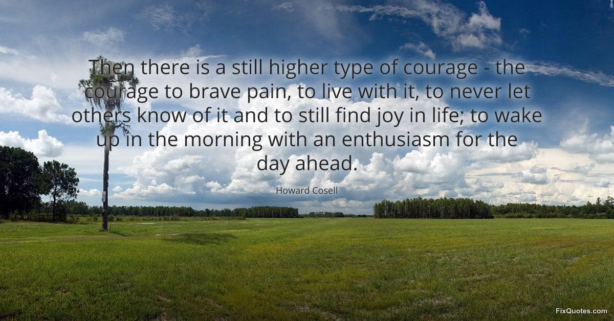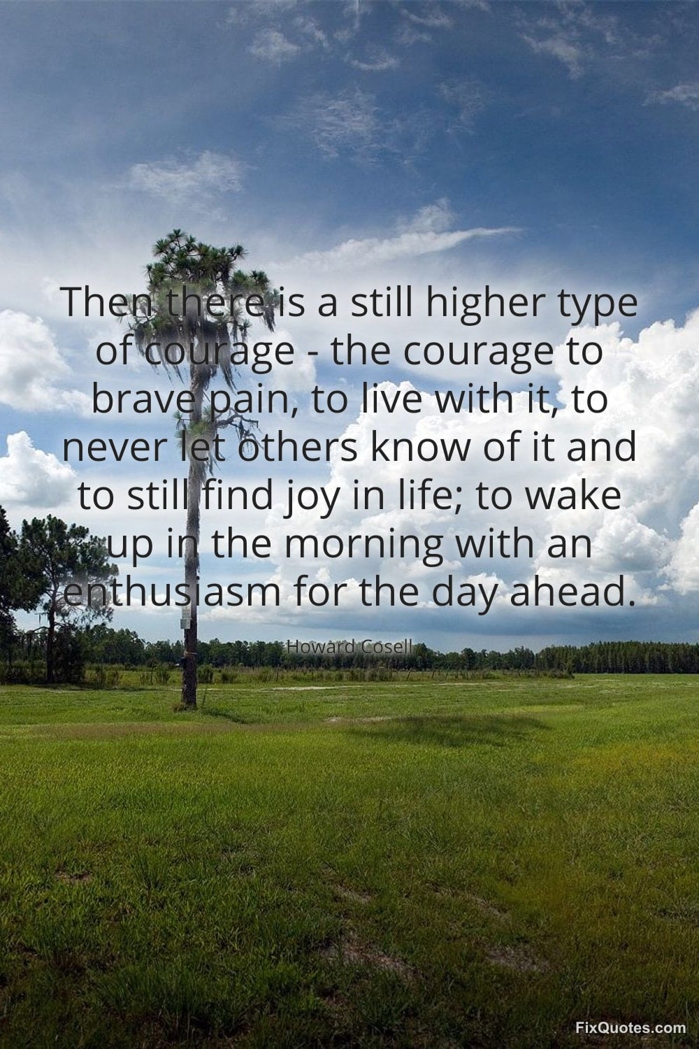 Cosell, Howard. "Then there is a still higher type of courage - the courage to brave pain, to live with it, to never let others know of it and to still find joy in life; to wake up in the morning with an enthusiasm for the day ahead." FixQuotes. January 16, 2026. https://fixquotes.com/quotes/then-there-is-a-still-higher-type-of-courage-130736/.