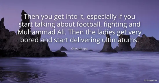 Reed, Oliver. "Then you get into it, especially if you start talking about football, fighting and Muhammad Ali. Then the ladies get very bored and start delivering ultimatums." FixQuotes. January 18, 2026. https://fixquotes.com/quotes/then-you-get-into-it-especially-if-you-start-18116/.