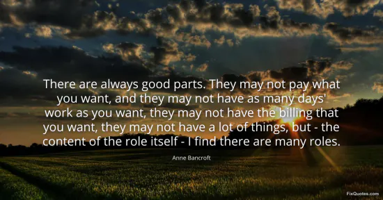 Bancroft, Anne. (2026, January 16). There are always good parts. They may not pay what you want, and they may not have as many days' work as you want, they may not have the billing that you want, they may not have a lot of things, but - the content of the role itself - I find there are many roles. FixQuotes. https://fixquotes.com/quotes/there-are-always-good-parts-they-may-not-pay-what-108526/