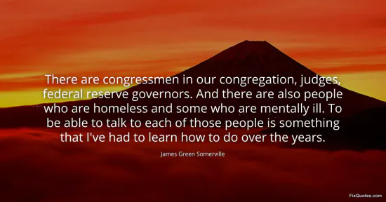 Somerville, James Green. "There are congressmen in our congregation, judges, federal reserve governors. And there are also people who are homeless and some who are mentally ill. To be able to talk to each of those people is something that I've had to learn how to do over the years." FixQuotes. January 15, 2026. https://fixquotes.com/quotes/there-are-congressmen-in-our-congregation-judges-167659/.